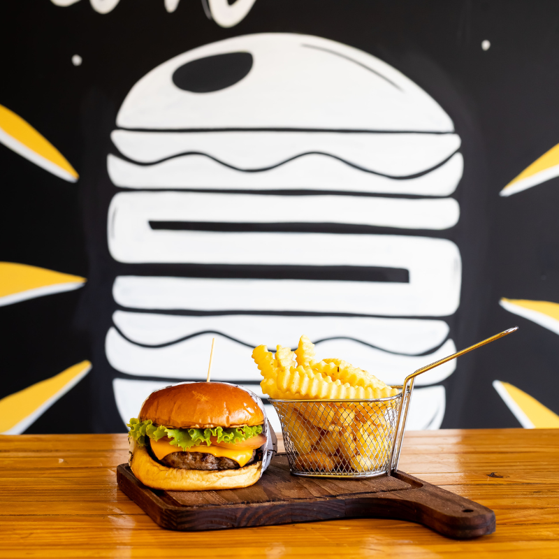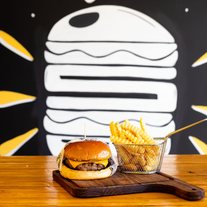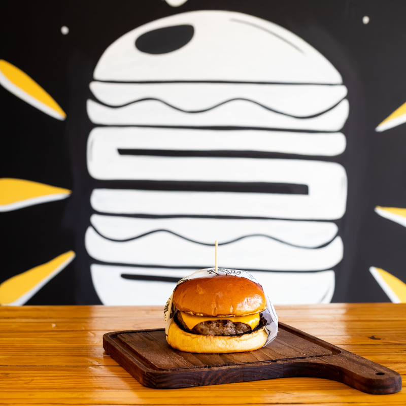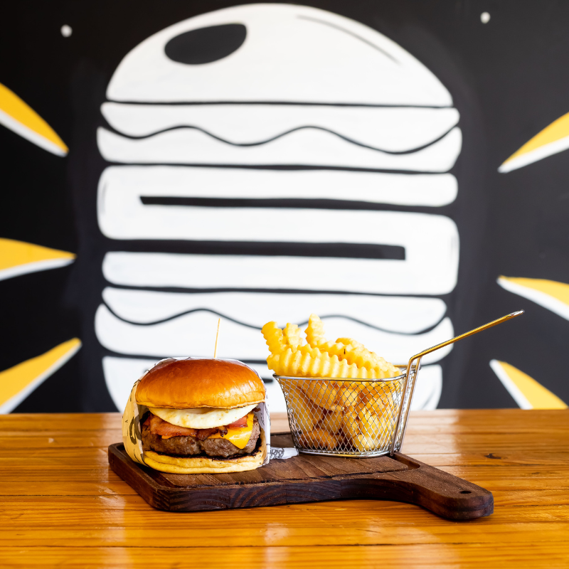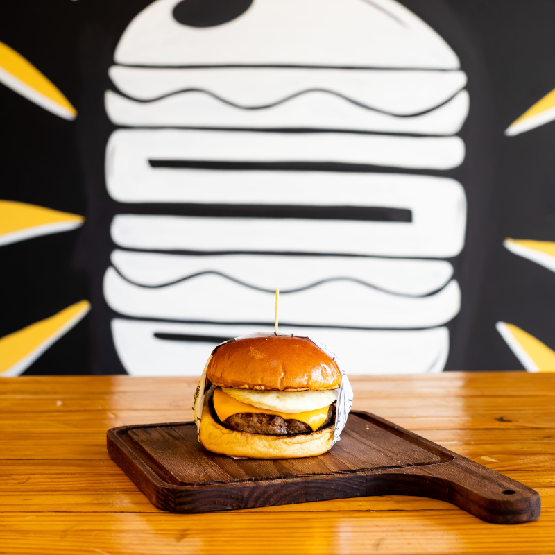 Pão de brioche selado na manteiga, hambúrguer artesanal 120g de carne bovina, queijo, molho e ovo.