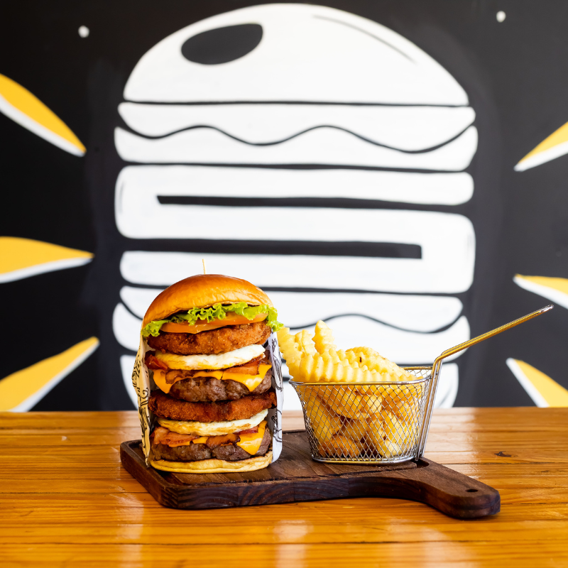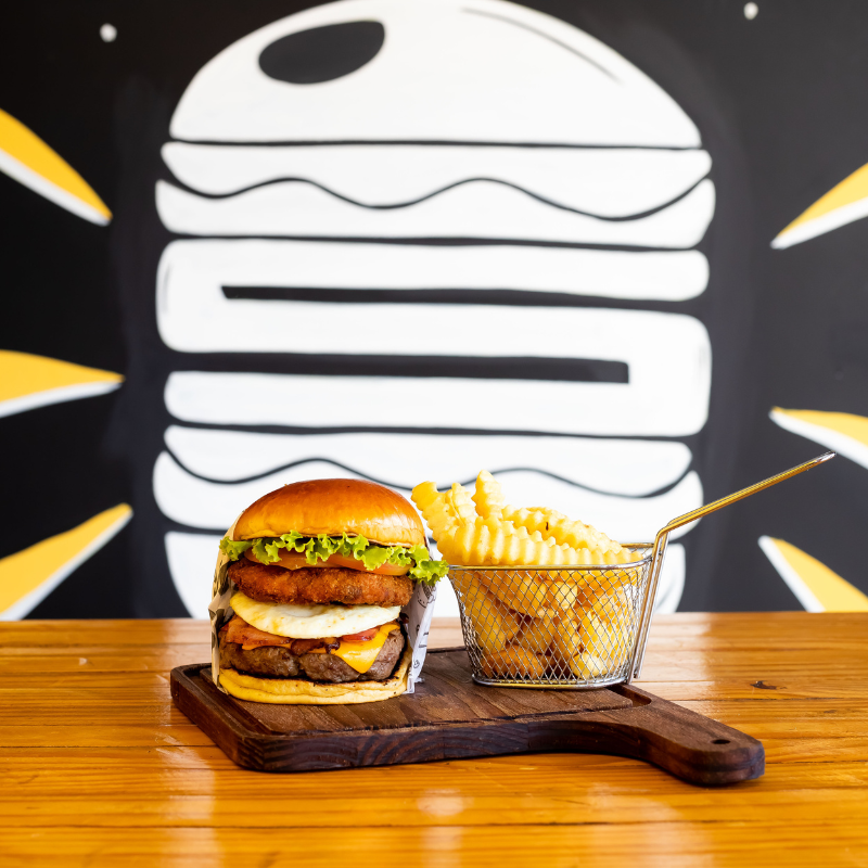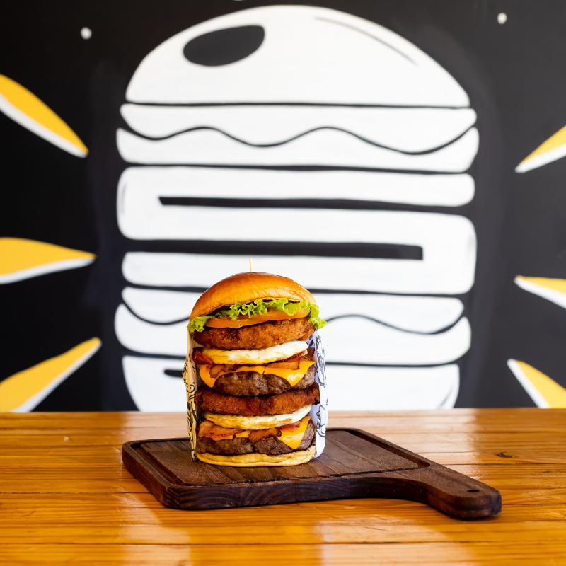 Pão brioche selado na manteiga, hambúrguer artesanal 120g de carne bovina, hambúrguer de frango empanado, queijo, molho, fatias de bacon, ovo, alface e tomate.