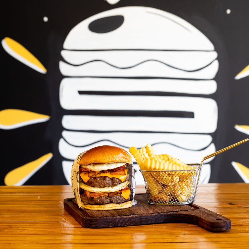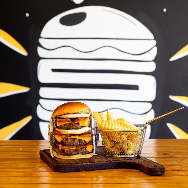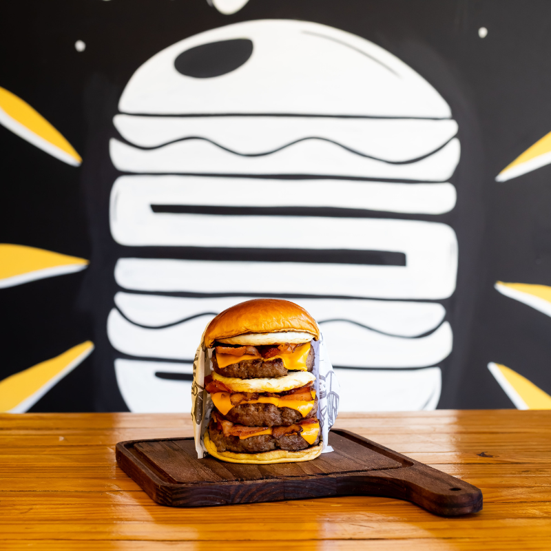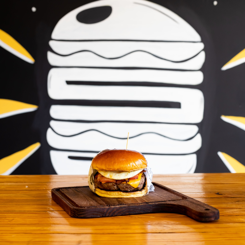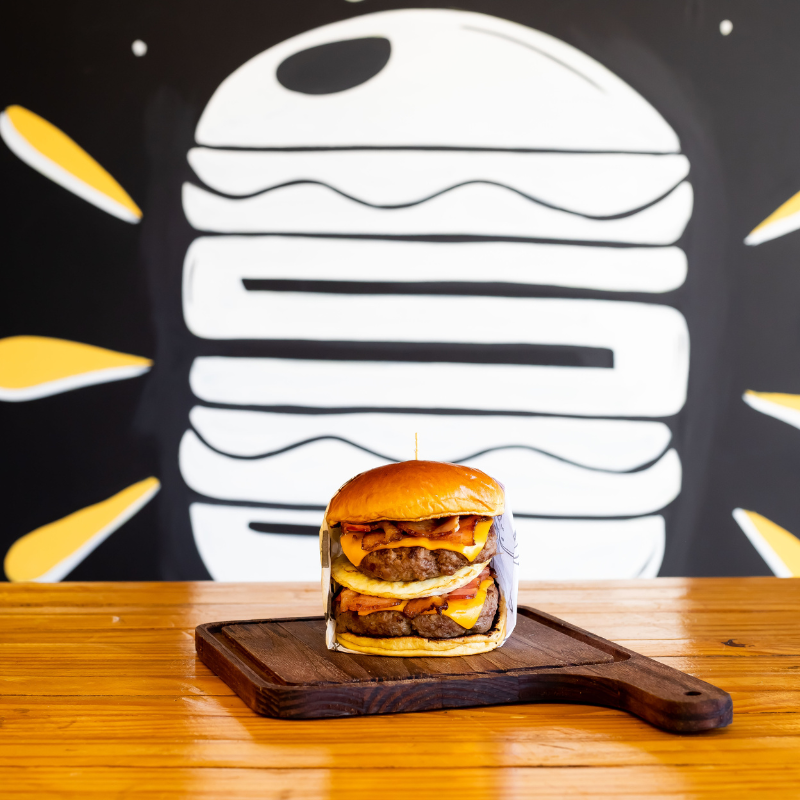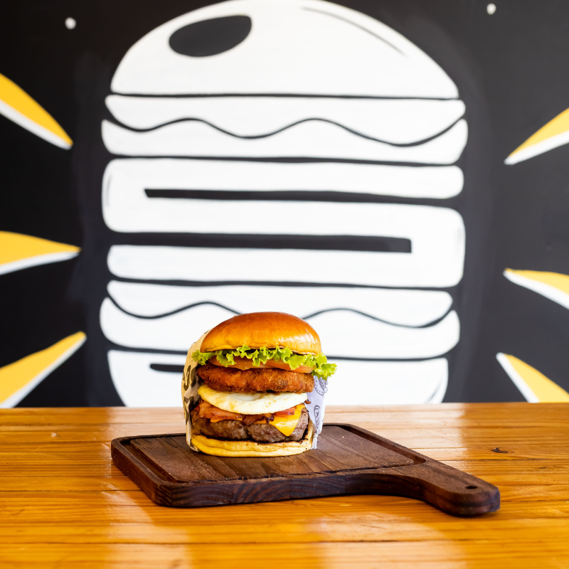 Pão brioche selado na manteiga, hambúrguer artesanal 120g de carne bovina, queijo, molho, fatias de bacon e ovo.