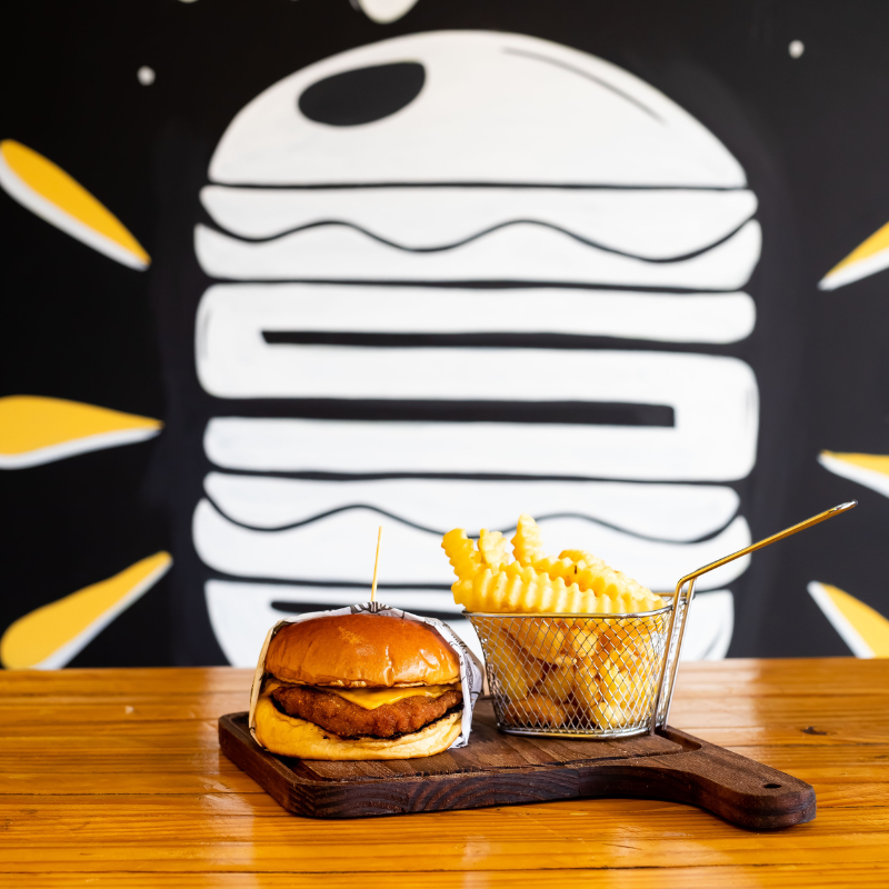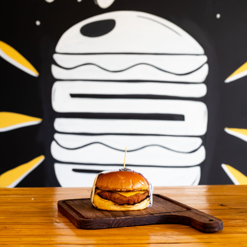 Pão de brioche selado na manteiga, hambúrguer artesanal 120g de carne de frango, queijo e molho.