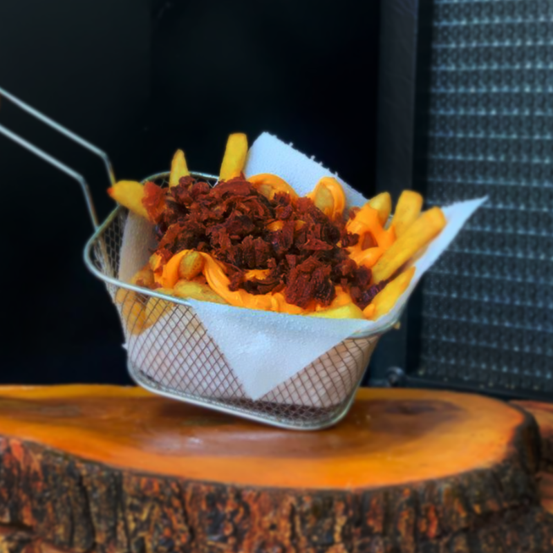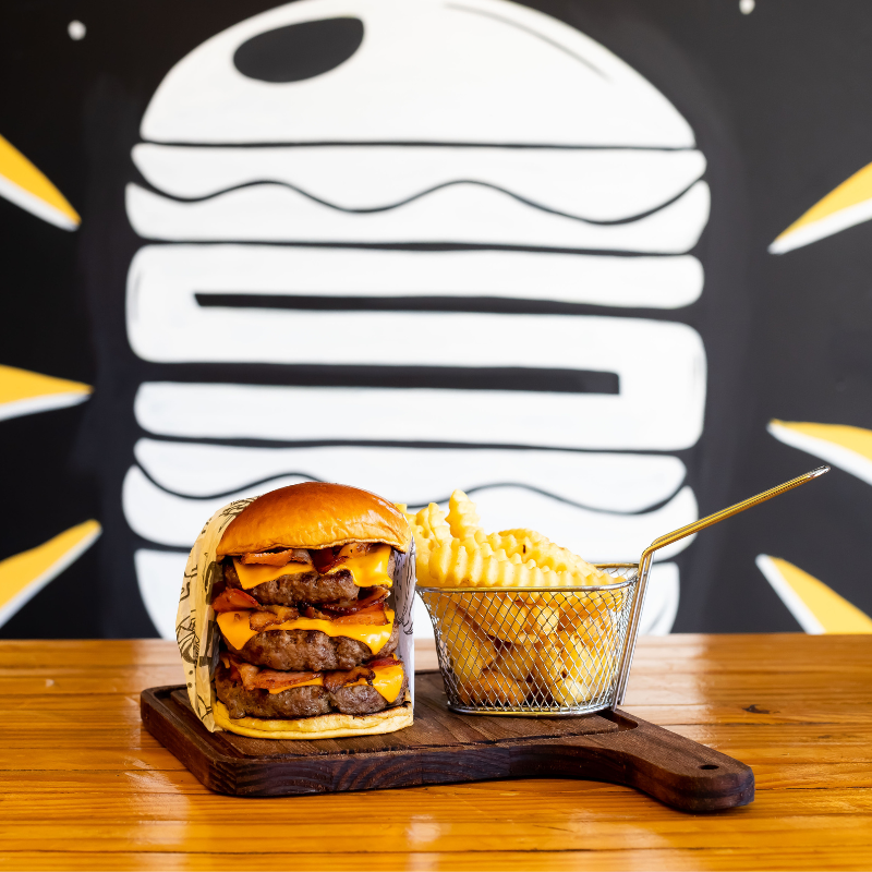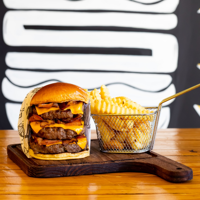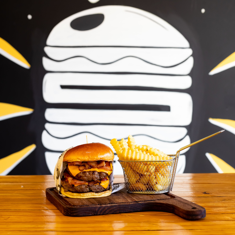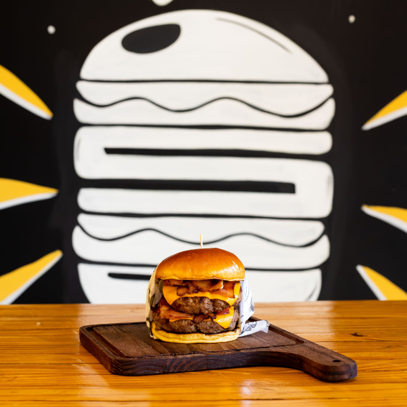 Pão brioche selado na manteiga, hambúrguer artesanal 120g de carne bovina, queijo, molho e fatias de bacon.