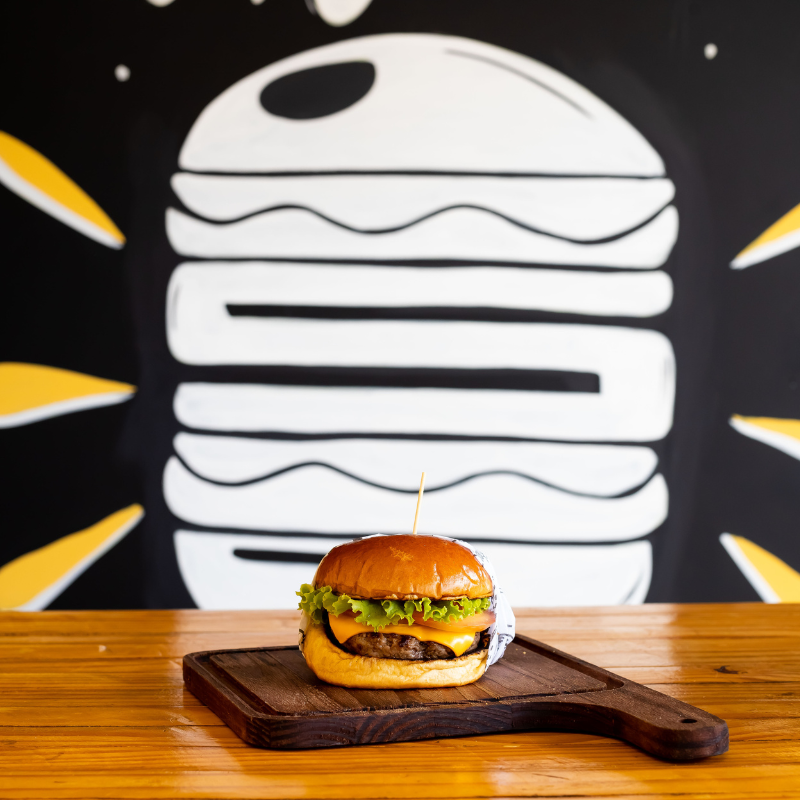 Pão de brioche selado na manteiga, hambúrguer artesanal 120g de carne bovina, queijo, molho, alface e tomate.